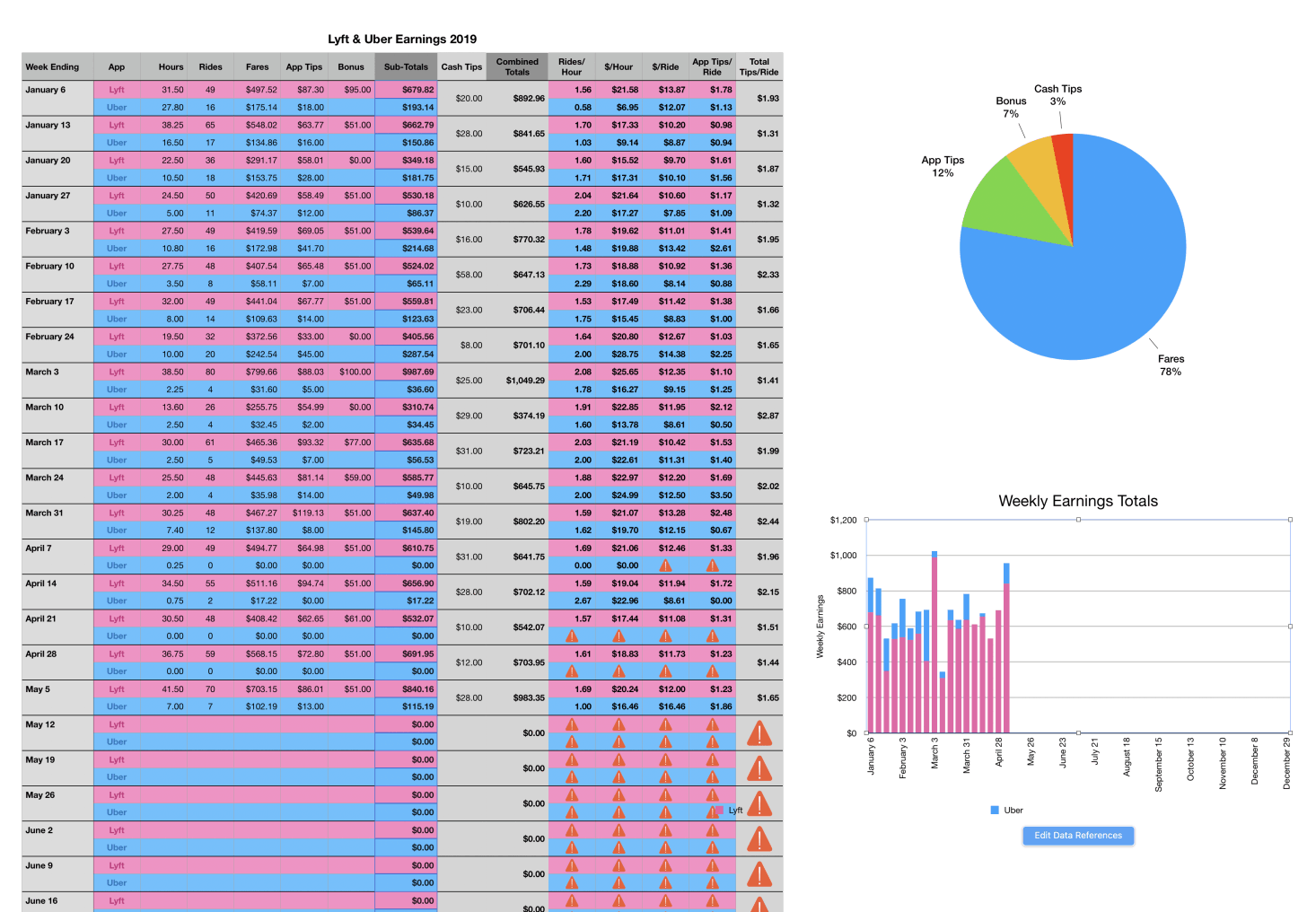Track Yearly Trends with This Worksheet! This spreadsheet has 2 rows for each week of the year, one for Lyft and one for Uber (color-coded blue and pink). Simply enter the numbers for each week froi