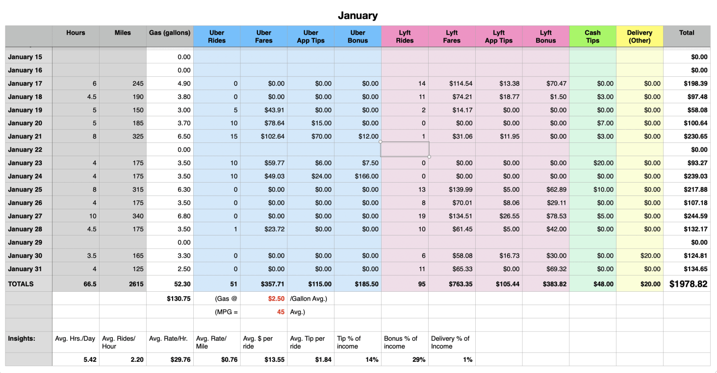 You can view or download your weekly statements from Uber and Lyft periodically throughout the year to update the sheet, or do it all at the end of the year.